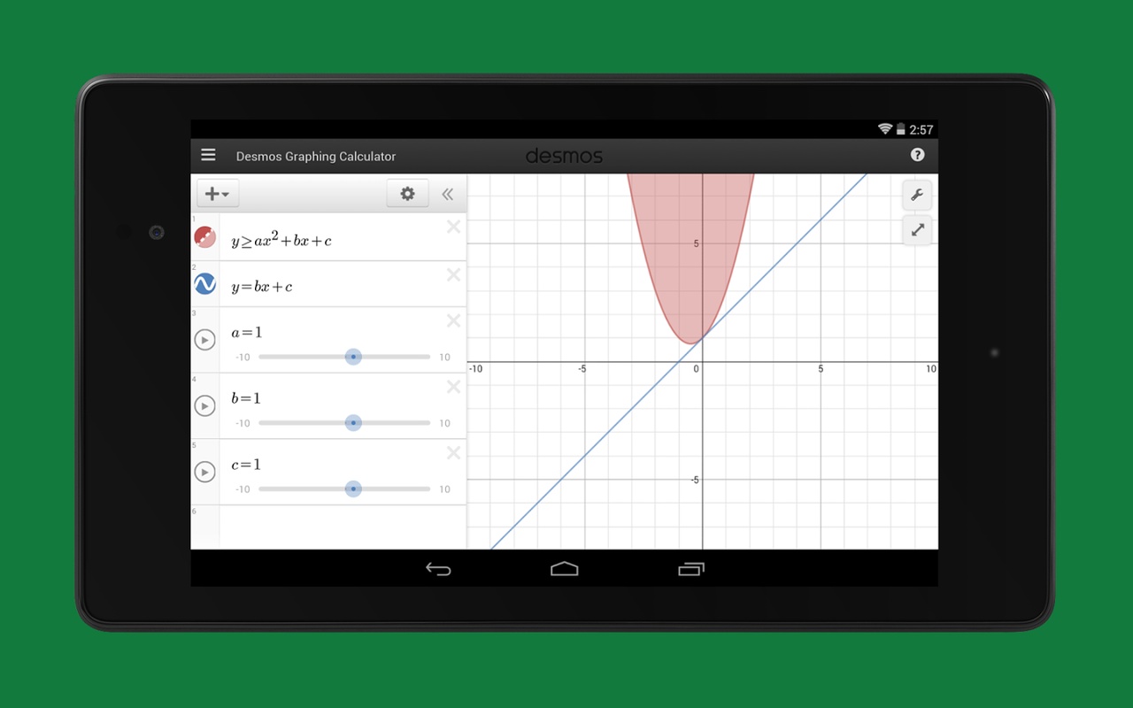 استكشف الرياضيات باستخدام حاسبة الرسوم البيانية Desmos القوية والسريعة. ارسم أي معادلة من الخطوط والقطع المكافئ إلى المشتقات وسلسلة فورييه. أضف منزلقات لإظهار تحويلات الوظائف ، وإنشاء جداول لإدخال البيانات ورسمها ، وتحريك الرسوم البيانية ، والمزيد - كل ذلك مجانًا.